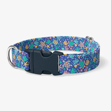Martingale collars are specially designed for training and specialized needs, providing more control for dogs that pull and for breeds with slimmer necks and narrow heads. Unlike a standard flat collar, it's not ideal for constant daily wear and should primarily be used during walks or training sessions. Martingale collars offer a customized fit, especially for dogs with a tendency to slip out of collars and provide gentle control without choking. Proper adjustment is required to ensure safety with this collar, and we offer both buckle and non-buckle options for almost all of our martingale collar styles.